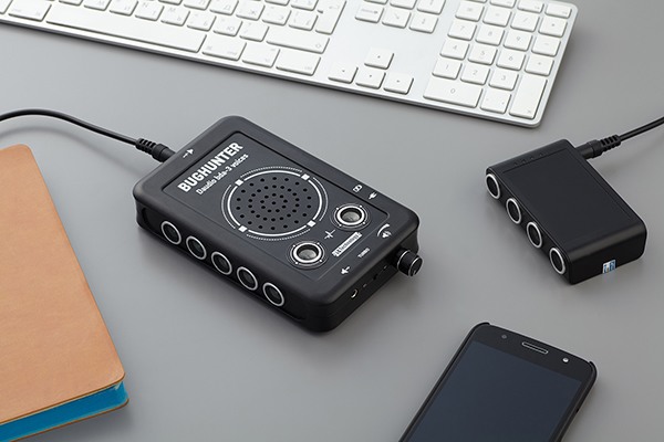 • Выход на ультразвуковую колонку. Конструкция подавителя "BugHunter DAudio bda-3 Voices" предусматривает возможность подключения внешней ультразвуковой колонки (покупается отдельно), позволяющей создавать более "плотную" УЗ-помеху в помещении, где ведутся переговоры. Эта колонка запитывается от сети 220 В через адаптер, а для ее соединения с самим подавителем используется кабель с разъемами mini-jack. Подавитель, работающий совместно с колонкой, превратит в бесполезные "железки" даже микрофоны, спрятанные за пределами зоны действия основных 7 УЗ-излучателей. Так, вы можете разместить колонку сбоку от собеседника или под столом для подавления скрытых средств звукозаписи.